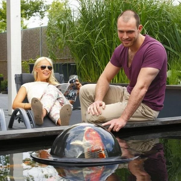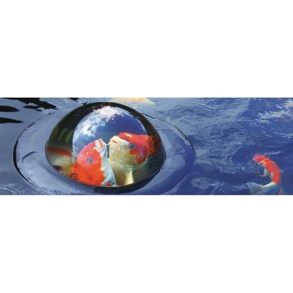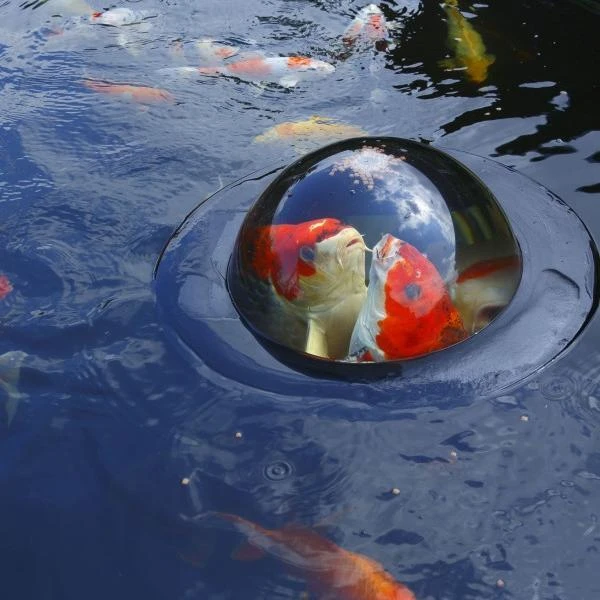 De vissen zullen in de doorkijkbol vaak een kijkje komen nemen die als een koepel op het water drijft en dat levert prachtige beelden op.