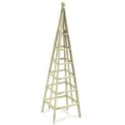 De obelisk is gemaakt van robuust dennenhout en kan ook in bloempotten of plantenbakken als bloemensteun dienen. De top is mooi afgewerkt met een grenenhouten bolvorm.