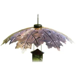 Vogels eten graag op een droge plek, beschut tegen regen, sneeuw en hagel. Dit schild van decoratieve metalen bladeren vormt een paraplu waaronder vogels droog en beschut kunnen eten. De mooie kap wordt geleverd met een sterke dubbele haak waarvan 1 haak bovenaan de kap voor bevestiging aan een tak of touw en 1 haak onder de kap voor de zadenvoedersilo, de pindahouder of het voederelement naar keuze.