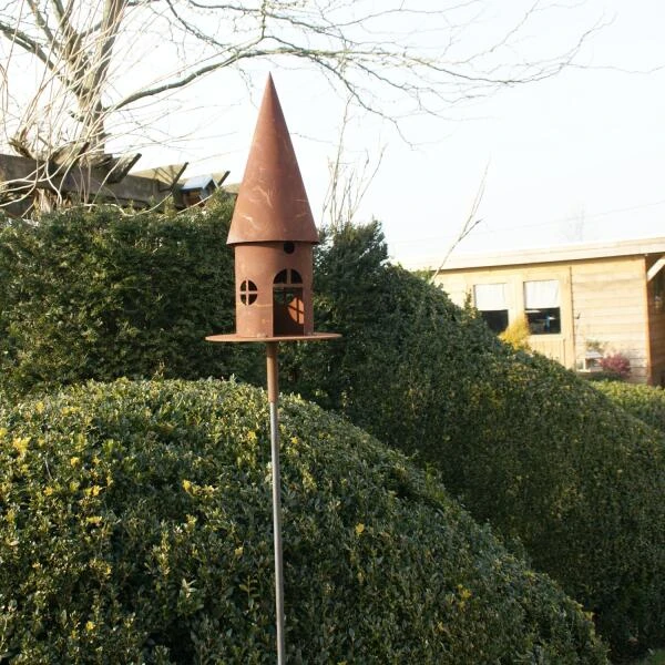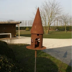 Het leuke voederhuis kan met de bijgeleverde stang makkelijk in de grond worden geprikt. Het geheel is met de hand gemaakt uit speciaal gevormd en behandeld metaal met een sfeervolle roestige look.